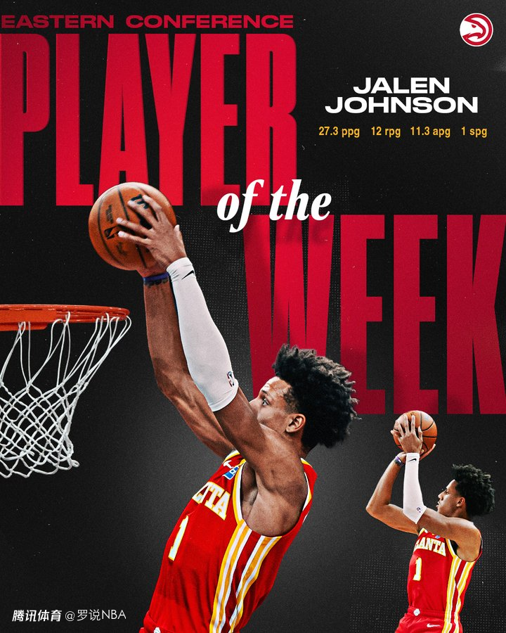 过去一周,约翰逊场均27.3分12.0篮板11.3助攻,帮助老鹰打出2胜1负的战绩。