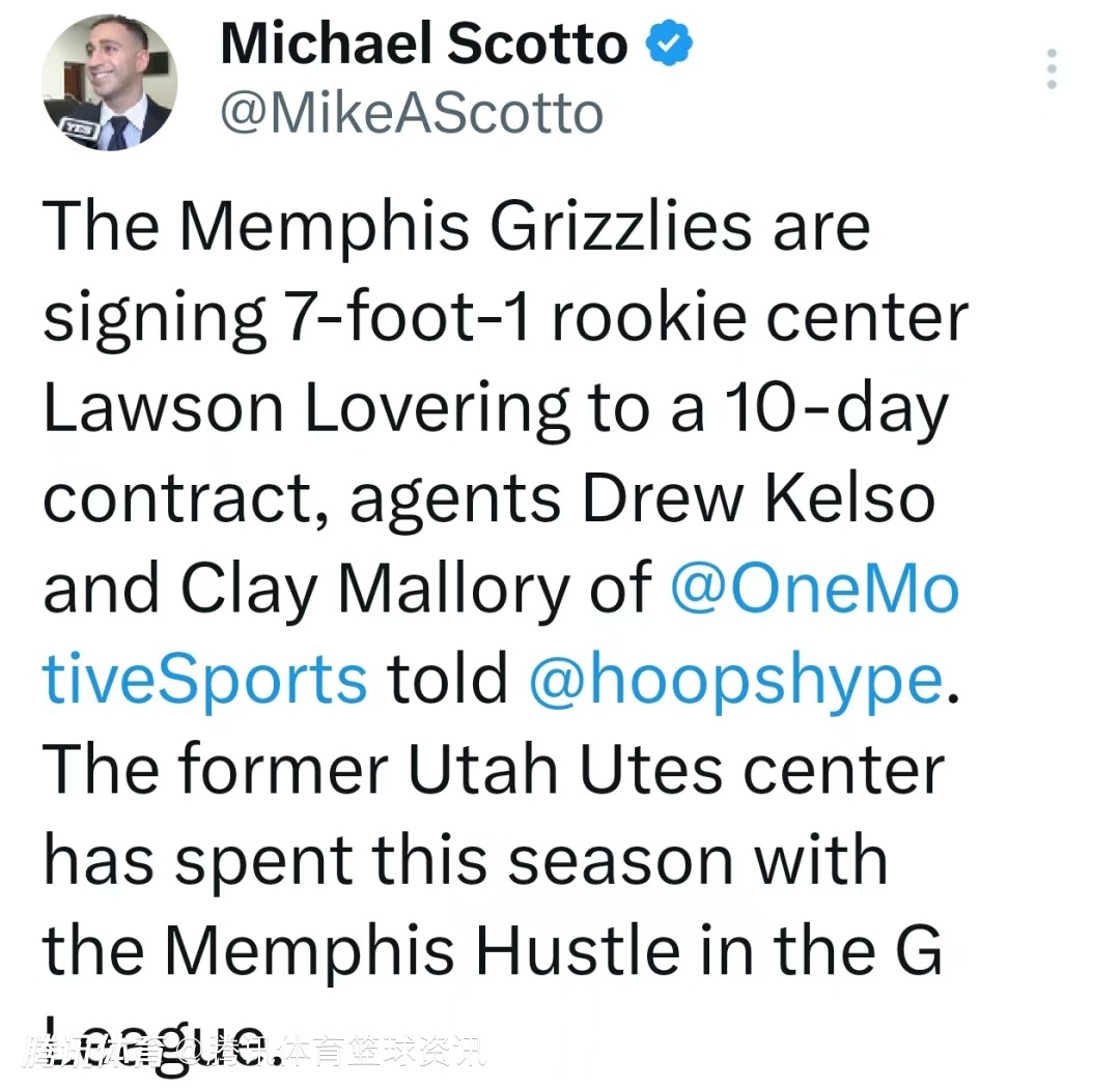 北京时间2月10日,据名记Michael Scotto报道,经纪公司OneMotiveSports的经纪人德鲁-凯尔索与克莱-马洛里证实,灰熊已与身高2米16的新秀中锋劳森-洛夫林签下一份10天短合同。