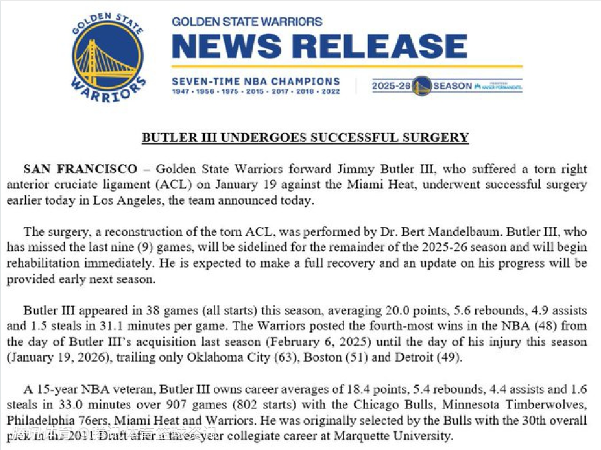 巴特勒的韧带重建手术由伯特-曼德尔鲍姆医生主刀,手术取得成功。巴特勒已缺席过去9场比赛,他将缺席2025-26赛季剩余所有比赛,并立即开始康复流程,预计可完全恢复,相关进展将在下赛季初更新。
