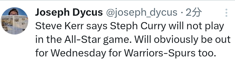 库里确定缺席全明星赛,因为球队将他的长期健康放在了短期出场之上。