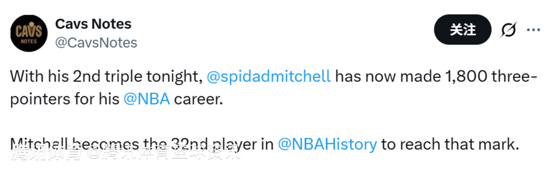 随着米切尔在第三节命中本场比赛的第二个三分球,这样一来,他的NBA生涯三分球命中数已经达到1800个,他也成为NBA历史上第32位达成这一里程碑的球员。