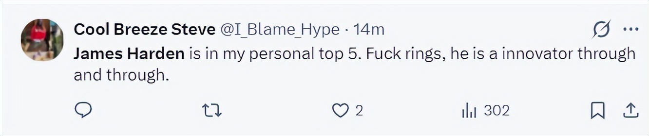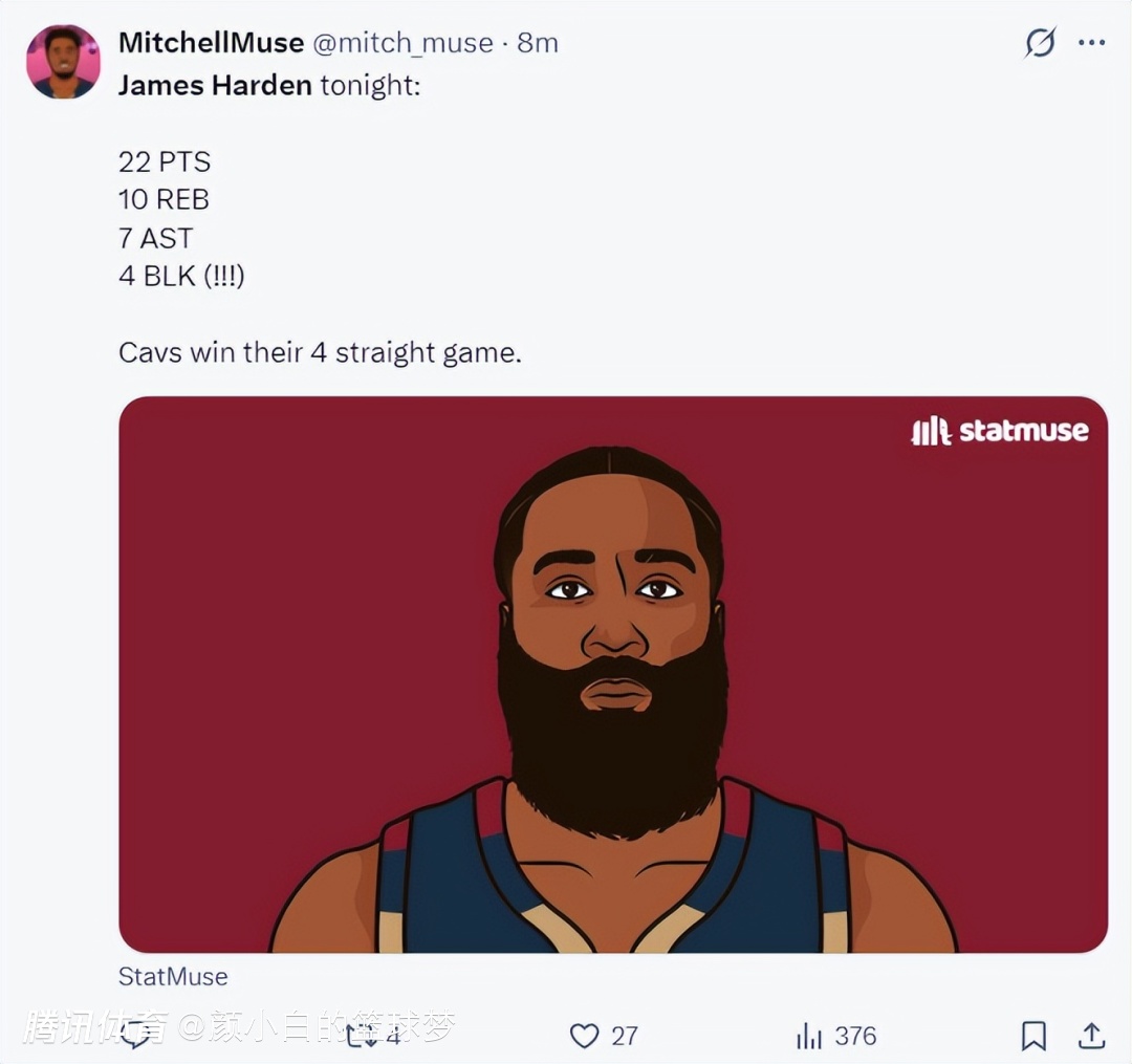 骑士球迷:哈登在我心目中一直以来都是联盟前五的球员,别管什么奖杯了,他就是一个勇于创新的球员。