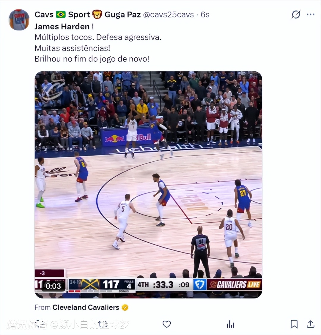 这场比赛詹姆斯-哈登再度成为克利夫兰的超级英雄,在上一场对阵国王的末节他连续命中关键三分,末节4中4拿到15分(7分钟),而这场比赛对阵联盟顶级豪强掘金,哈登在末节又用三分球帮助骑士续命。