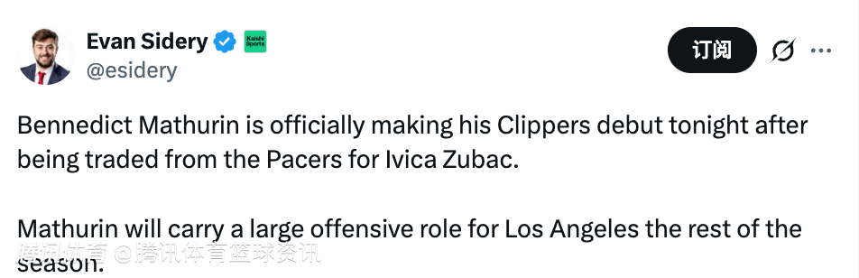 北京时间2月11日,据美记Evan Sidery报道,马瑟林在被交易至快船后,将在今天正式完成他的快船首秀(今天上午9点,快船将客场对阵火箭)。在本赛季剩余的比赛中,马瑟林将在洛杉矶快船队承担重要的进攻角色。