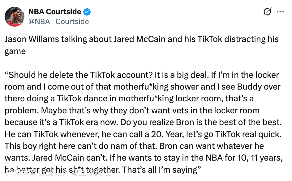 白巧克力表示:“他应该删掉TikTok账号吗?这确实是个大问题。如果我在更衣室里,洗完澡出来看到大伙在更衣室里跳TikTok舞,那绝对是个问题。也许这就是他们不希望老将待在更衣室的原因——现在是TikTok时代了。”
