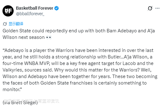 北京时间2月11日,据记者Brett Siegel报道,金州下赛季有望同时得到阿德巴约与阿贾-威尔逊。