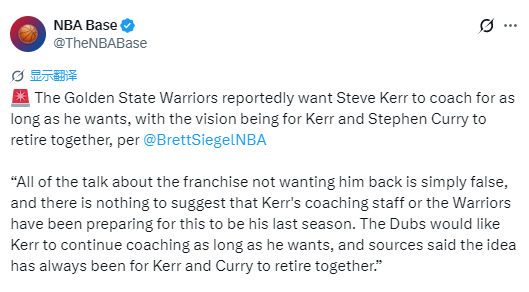 Siegel表示:“所有关于球队不希望他回归的传言都是假的,没有任何迹象表明科尔的教练组或勇士队在为本赛季是他最后一季做准备。勇士希望科尔能继续执教,只要他愿意。消息人士称,一直以来的设想就是让科尔和库里一起退役。”