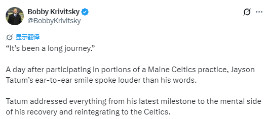 塔图姆强调,康复过程存在变数,必须尊重计划。此前有报道称他可能考虑直接等到下赛季再复出,他本人回应:“我还在一步步评估,还在按康复流程走。没有说回,也没有说不回,关键是100%恢复健康,严格遵守康复计划。”