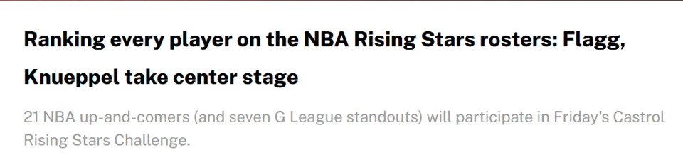 北京时间2月11日,NBA全明星新秀赛将在北京时间2月14日进行,届时,中国球员杨瀚森将代表发展联盟参加这一赛事。美媒对参加这一赛事的29名球员(包括目前受伤被递补的)进行排名,杨瀚森被排在第22位。