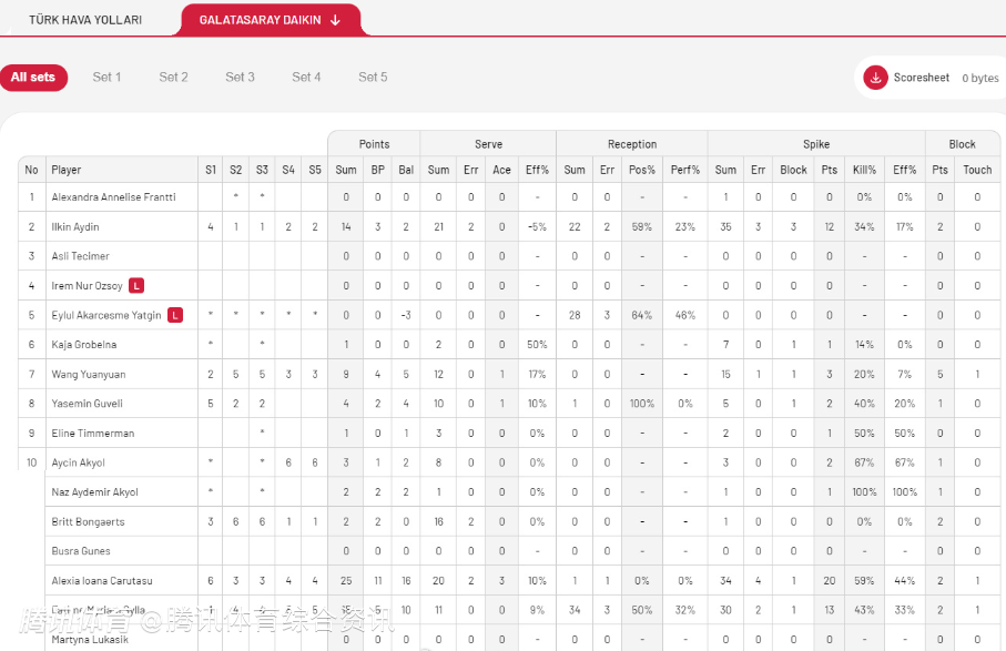 加拉塔萨雷主帅调度堪称关键,1-2落后时,第四局果断变阵,将王媛媛调回小副攻,让背飞更扎实的10号阿克约尔主打大副攻。阿克约尔第四局2扣2中+1拦,瞬间扭转局面,带队完成逆转。