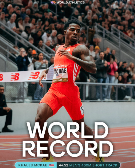 在2月13日进行的美国室内田径泰森邀请赛上,参加了去年东京世锦赛的美国男子400米高手卡勒布-麦克雷,在室内400米跑上,跑出44秒52的个人最佳。