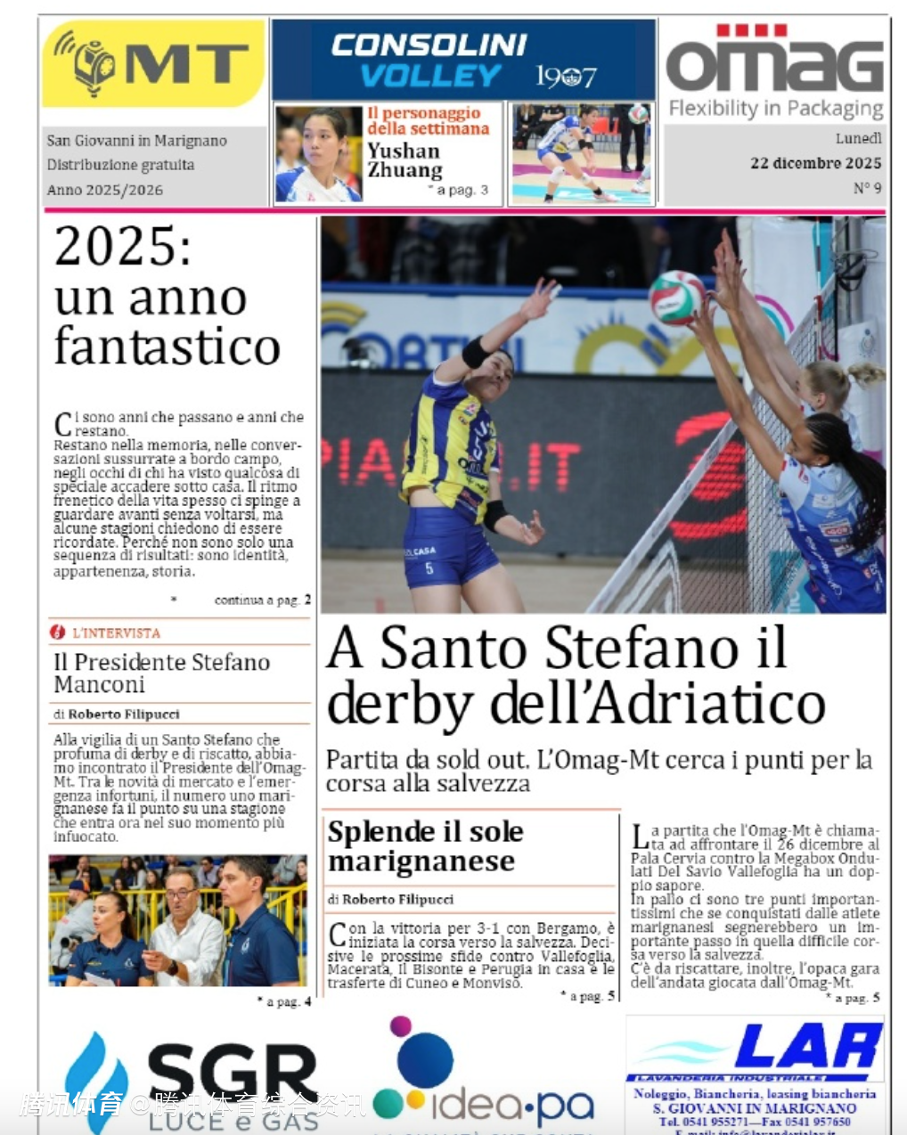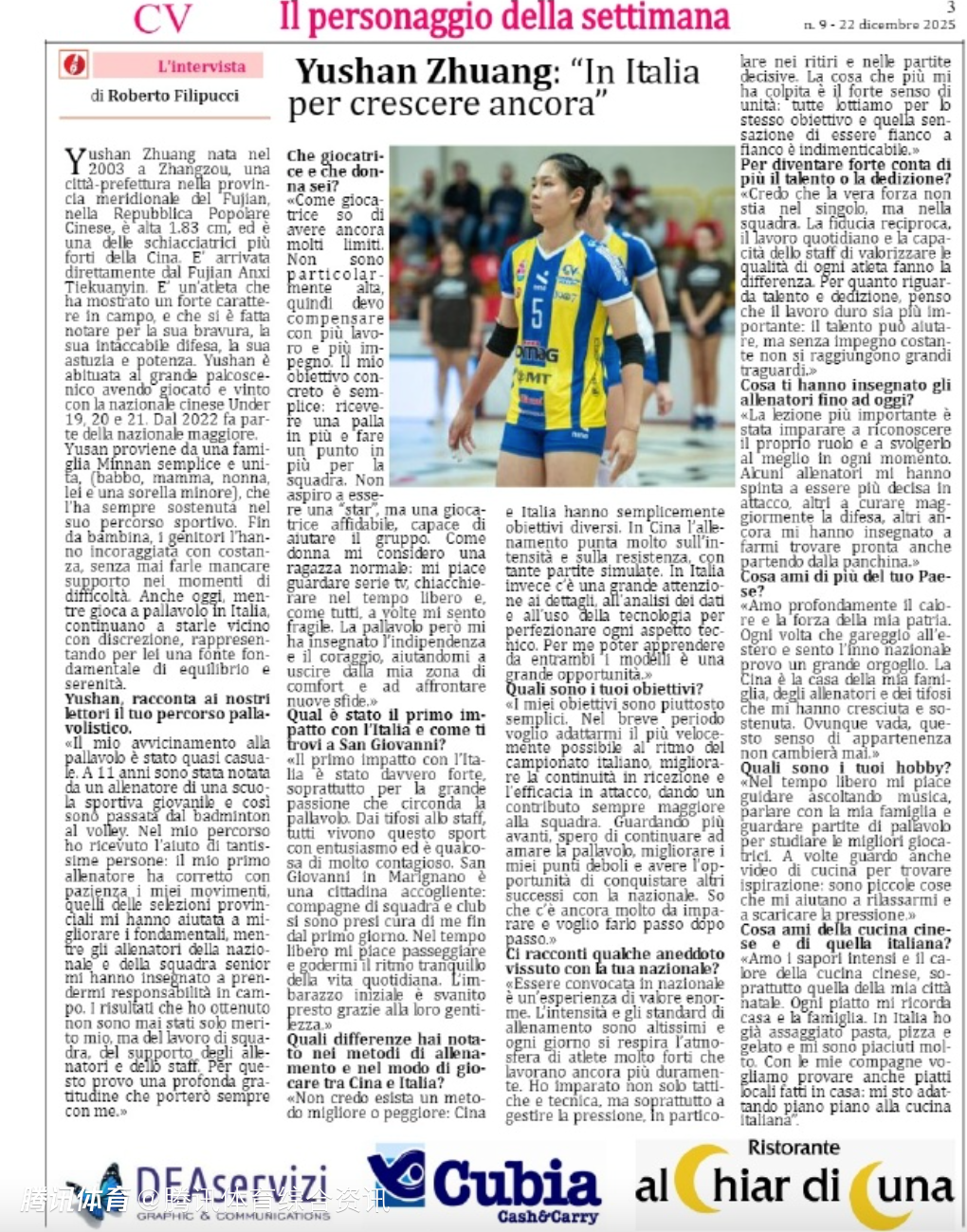 北京时间12月23日,意甲圣乔瓦尼女排第九期队报即将发售,电子版已经可以在线观看。新加盟的中国外援庄宇珊凭借连续三场20+的表现成为本期主角:封面“含庄量”很高,三张图片都给了庄宇珊;第三版庄宇珊的采访更是独占了整版报纸。