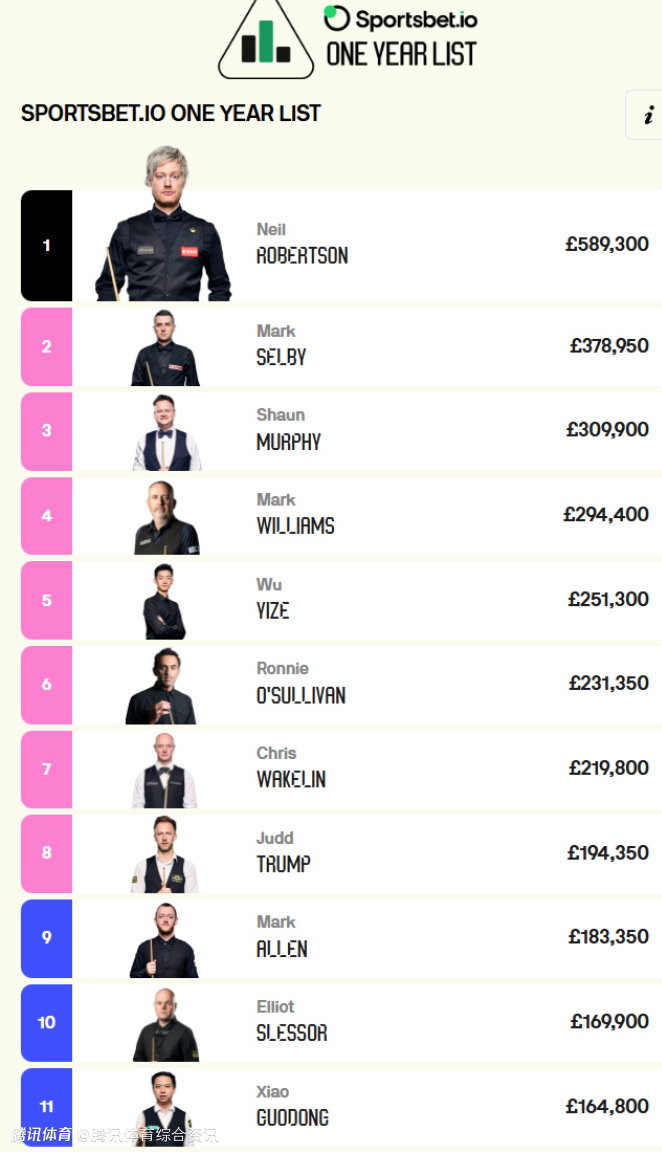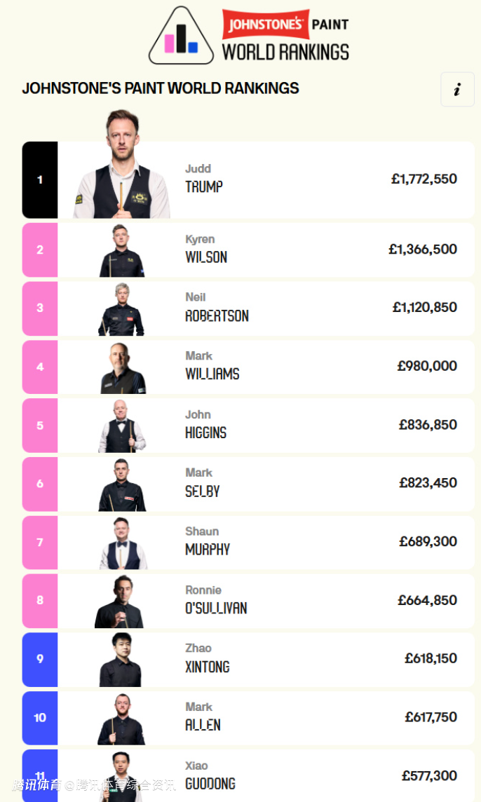 中国球员方面,赵心童位于第9位,肖国栋位于11位,丁俊晖位于12位,吴宜泽位于13位,斯佳辉位于16位。