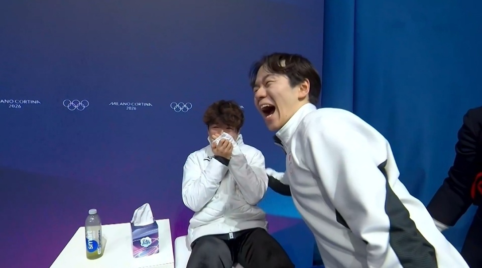 键山优真(日本)-花样滑冰:键山优真对获得铜牌的佐藤骏热烈而衷心的庆祝表明,友谊和对同龄人的真正快乐可以超越任何竞争关系。