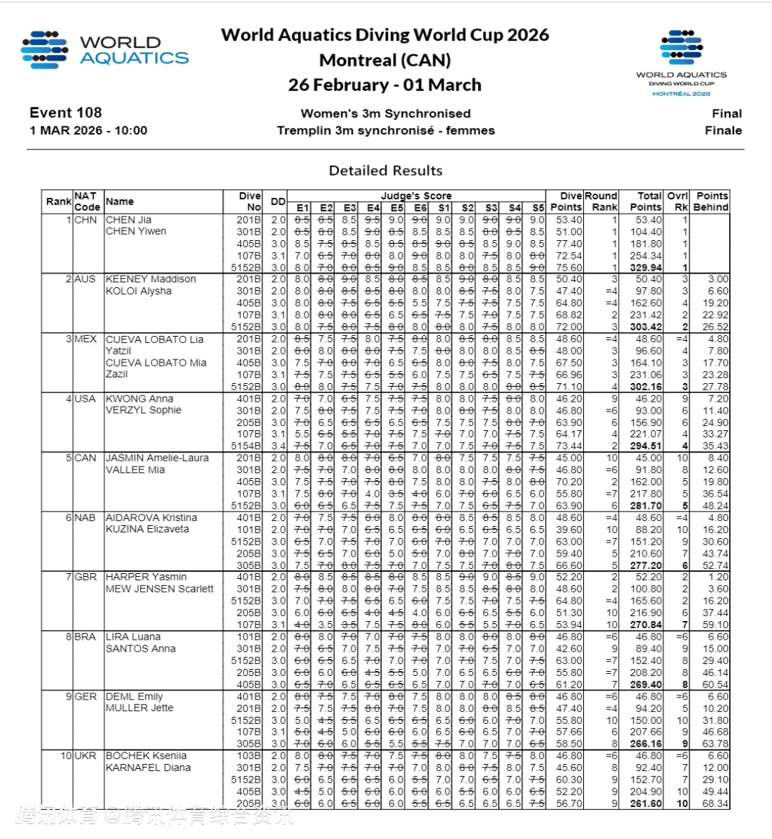 北京时间3月2日,跳水世界杯加拿大站结束女子双人三米板比赛,中国选手陈艺文/陈佳每一跳都是本轮最佳,以329.94分夺得冠军,澳大利亚(303.42分)和墨西哥(302.16分)分获银铜牌。