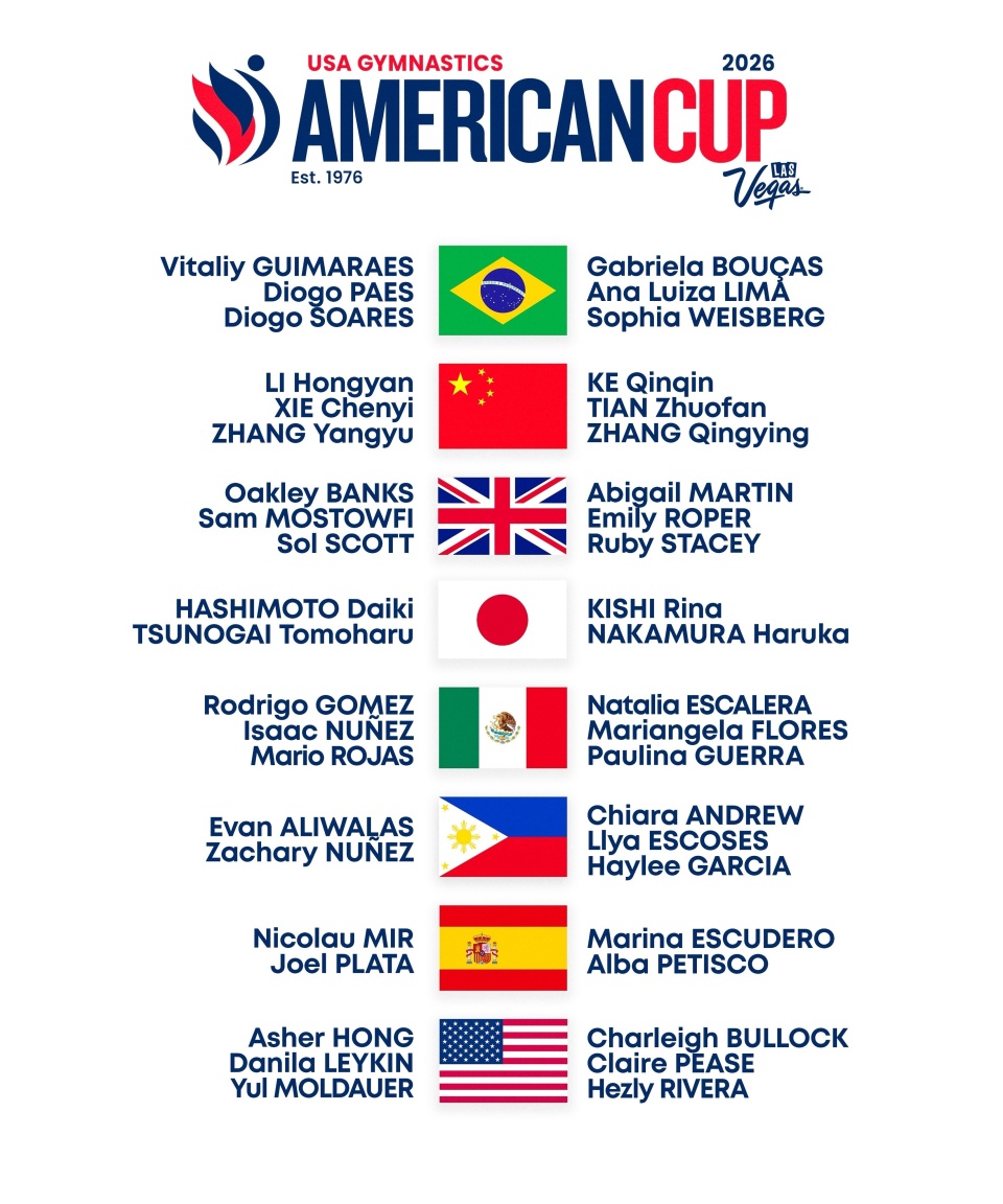 即将于3月7日在亨德森市开战的2026“美国杯”体操邀请赛,最终名单确认:中国派出了李鸿颜,谢晨屹,张杨煜三位男选手,以及柯沁沁,田倬凡,张清颖三位女选手出战!