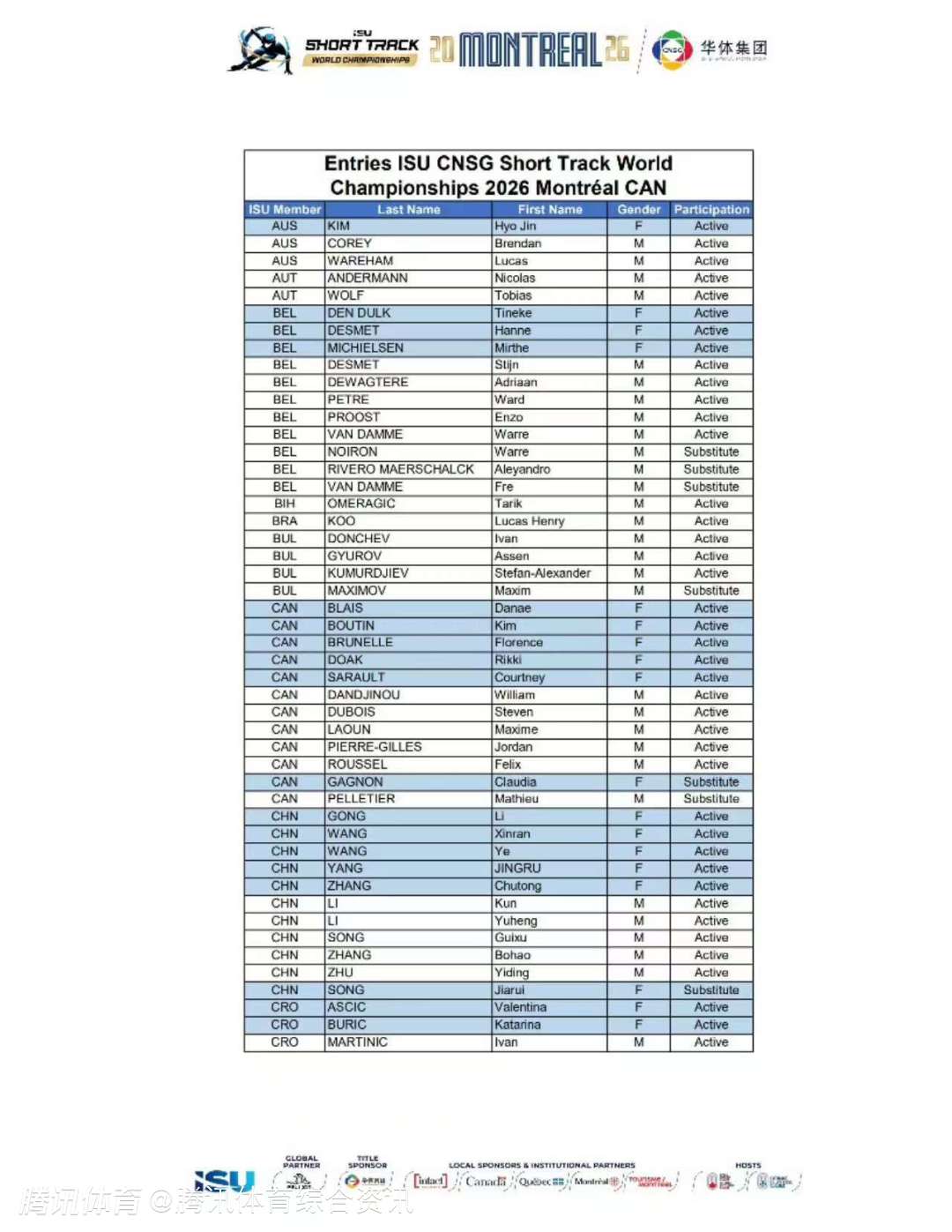 北京时间3月4日,国际滑联官方正式公布2026年短道速滑世锦赛参赛阵容。