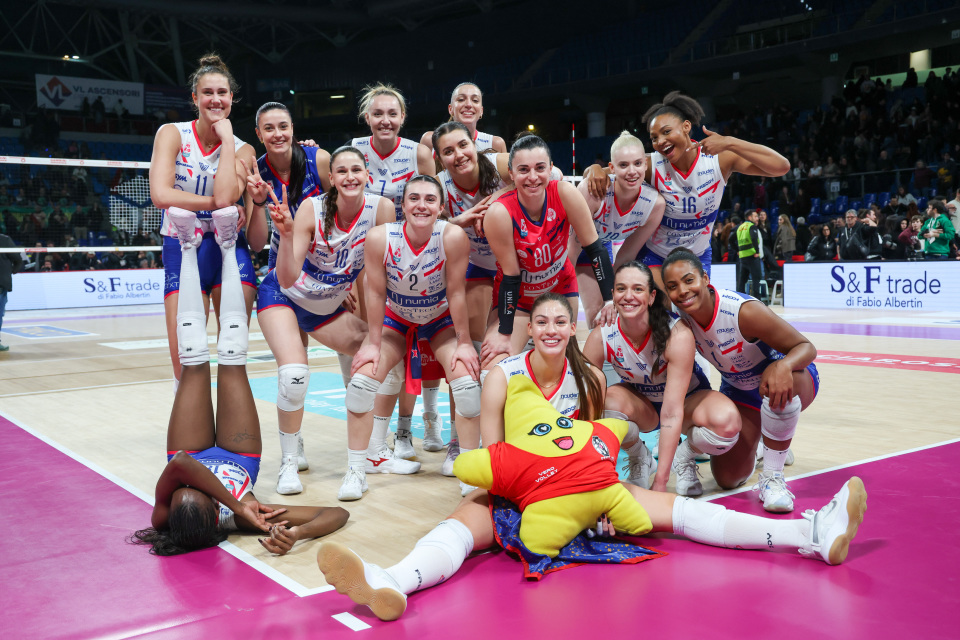 米兰女排双杀瓦莱福利亚晋级4强后合影