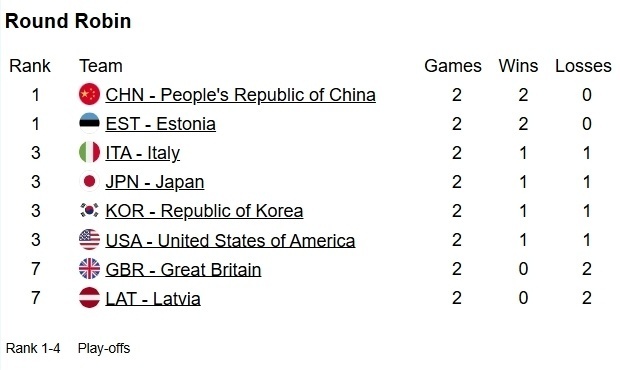 第二轮之后,中国和爱沙尼亚都是两连胜并列第一,意大利、日本、韩国、美国并列第三。