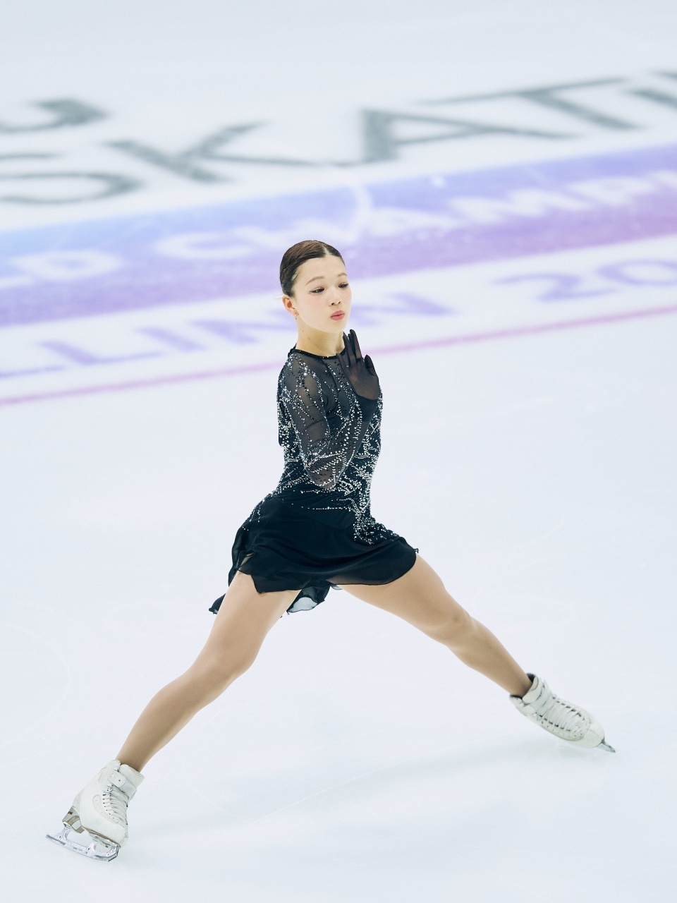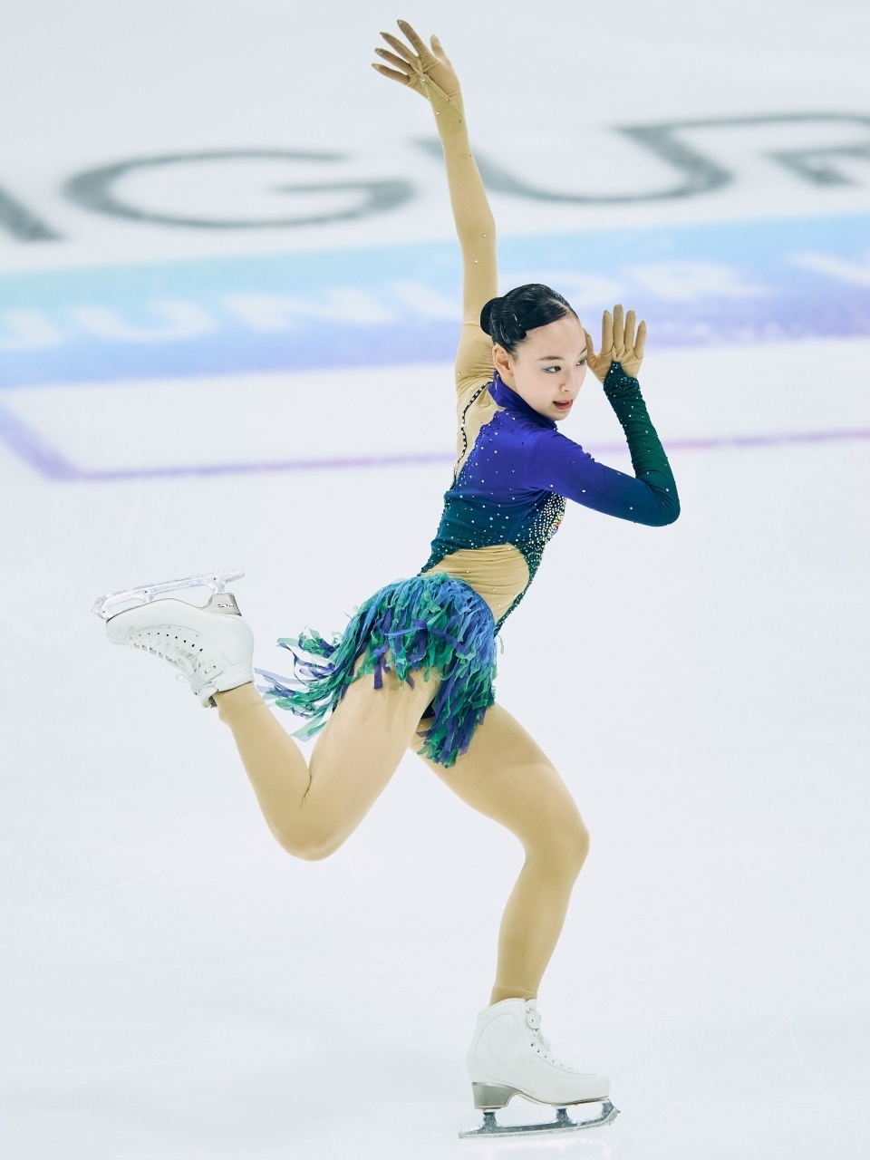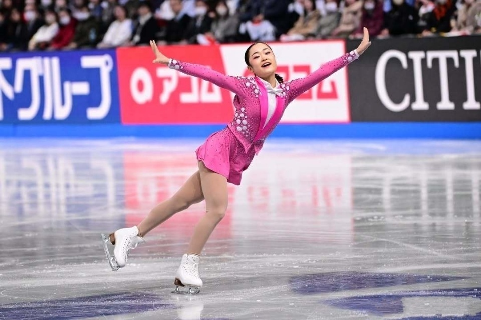 冈万佑子的表现主题是“孔雀”,勾手三周接三周、阿克塞尔两周与后外结环三周之间,通过跳进蹲踞旋转过渡,后两跳落冰有创造性滑出。