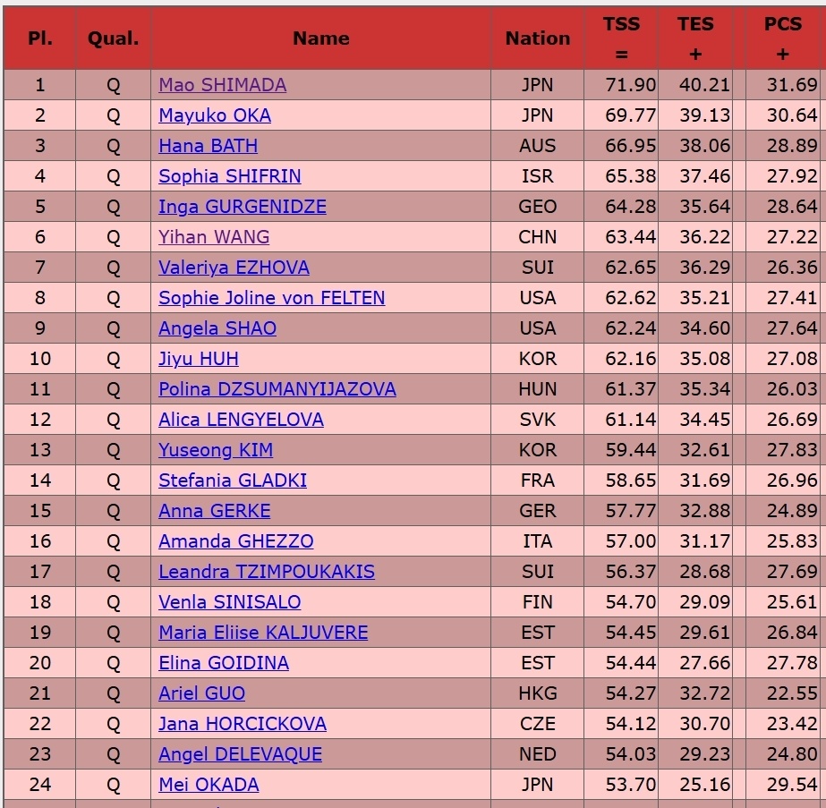 日本名将岛田麻央以71.90技压群芳,冈万佑子以69.77紧随其后。澳大利亚、以色列、格鲁吉亚选手排在3-5位。