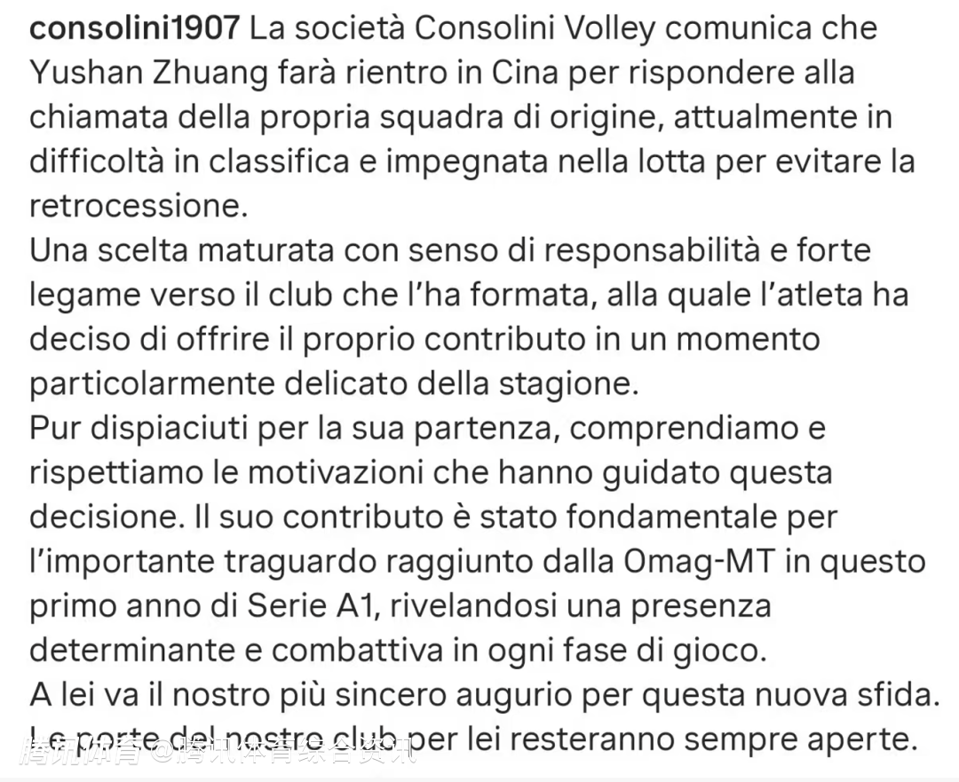 “Consolini Volley俱乐部宣布,庄宇珊将返回中国,响应其目前正处于联赛困难时期、为保级而战的母队征召。