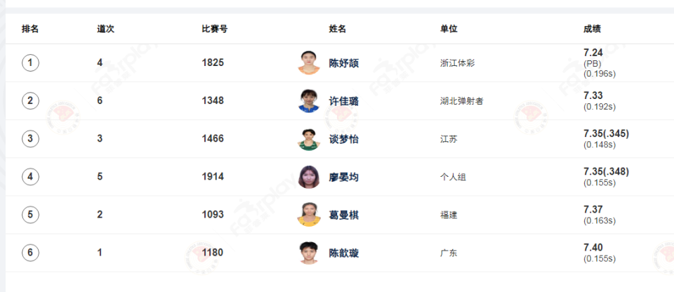 在今天下午稍早结束的本站女子60米预赛,陈妤颉7秒33排名第一,谈梦怡、廖晏均、葛曼棋成绩均是7秒36,去年全运会女子跳远冠军谈梦怡以7秒358排名第二,廖晏均、葛曼棋以7秒359并列预赛总成绩第三。