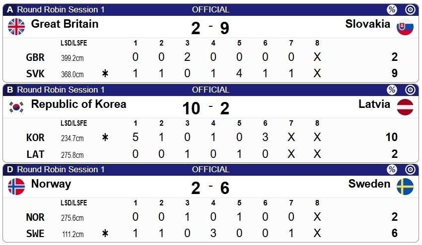 另外三场比拼里,英国2-9斯洛伐克、韩国10-2拉脱维亚、挪威2-6瑞典。