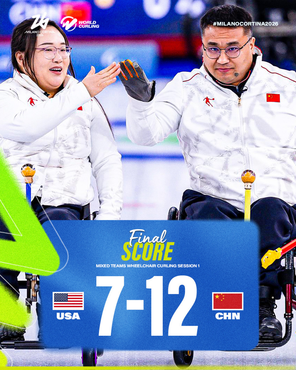米兰冬残奥会轮椅冰壶混合团体结束第一轮的比拼:由四垒王海涛、三垒陈建新、二垒张明亮、一垒李娜娜、替补张强组成的中国队,发挥出高水平,他们以12-7力克美国,迎来了循环赛开门红。