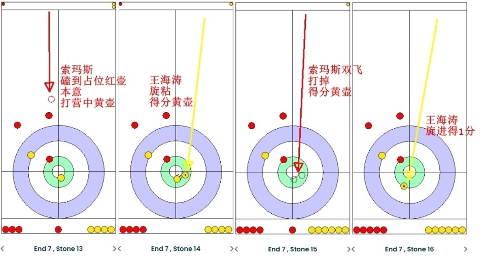 第七局:因为美国还是7-9落后,即便后手多边区占位打甩战术效果不俗,但他们只剩下第八局一个后手,所以还是要在第七局对中国进行控分。