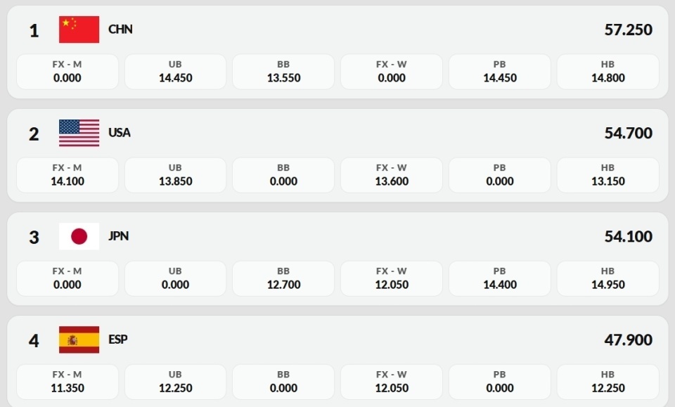 虽然日本两位女将最后一轮崩盘、美国男队两人大跌眼镜,中国也有张清颖掉下器械,可在前两轮就用光全部气力的西班牙队,最终四人只有47.90。