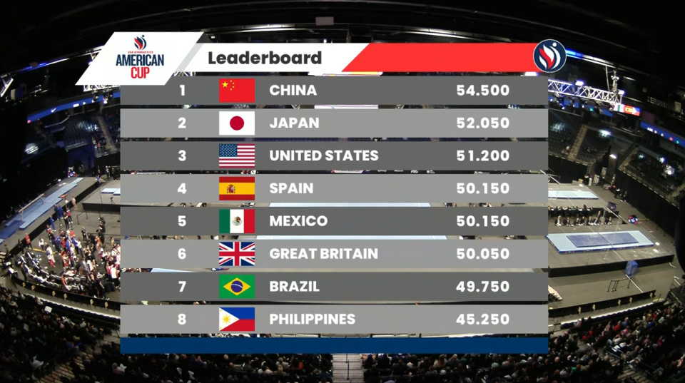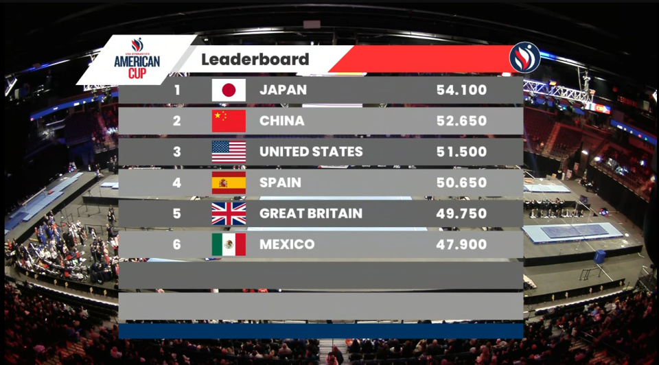 东道主美国因为男选手发挥欠佳,以54.70摘银;桥本大辉率领的日本队,则被女选手拖了后腿,以54.10收获铜牌。