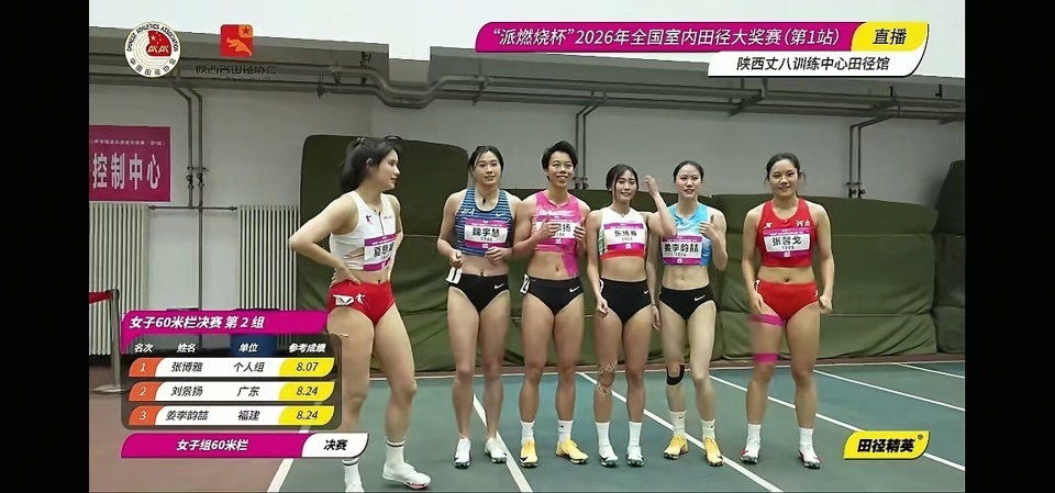 北京时间3月8日,2026年全国室内田径大奖赛(第1站),新科全运会冠军刘景扬输给了中国宝岛台湾的妹纸张博雅。张博雅这两个月太猛了,2月刚在天津以8秒12拿下亚洲室内锦标赛冠军,今天又以8秒07击败了新科全运会女子短跨冠军刘景扬。其实最失落的是夏思凝,现在又多了一个张博雅,以后她更难上领奖台了。