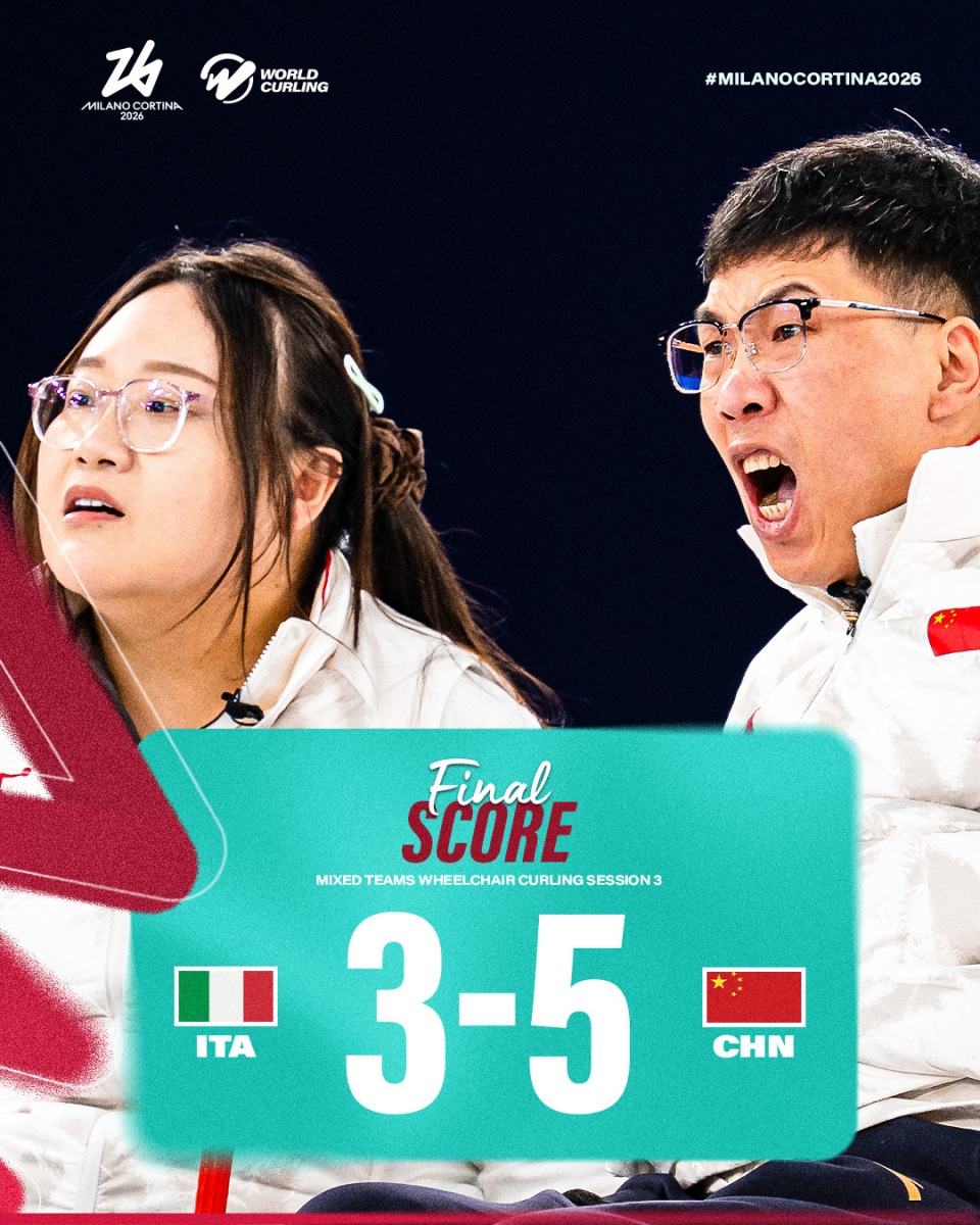 在米兰冬残奥会轮椅冰壶混合团体第三轮,中国队迎战第二个对手意大利时,在4/5/6实现连续3局偷分,并牢牢把控场上节奏,最终以5-3拿下东道主,迎来两连胜。