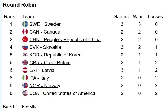 目前三战全胜的瑞典队排在第一,加拿大和中国并列第二;斯洛伐克和韩国排在第四和第五。
