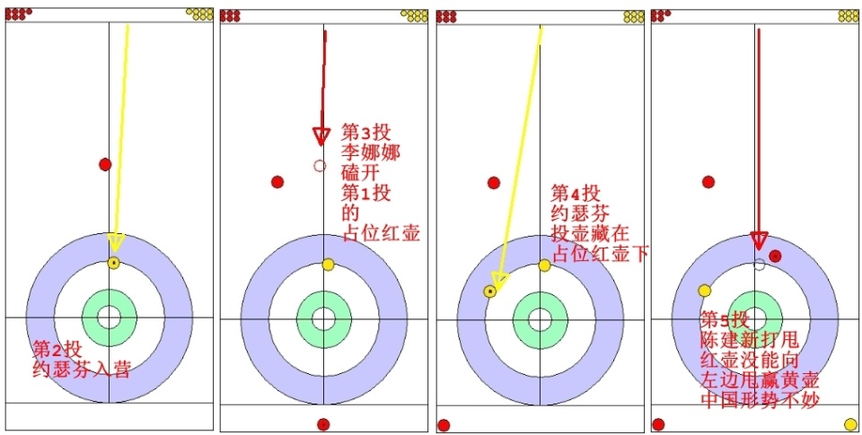 因为这样两头堵的局面,让加拿大抓住了中国队技战术造成的心理破绽,在约瑟芬第二投,将黄壶藏到李娜娜第二投磕开的边区红壶后,局面对中国就已经很不利了。