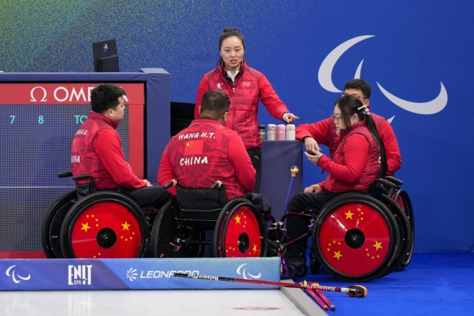 米兰冬残奥会轮椅冰壶混合团体第七轮:中国和加拿大展开了一场重量级对决:大概是因为将原本二垒张明亮和三垒陈建新的位置交换,磨合出现问题,最终中国队以4-9不敌加拿大,提前一局握手认输。