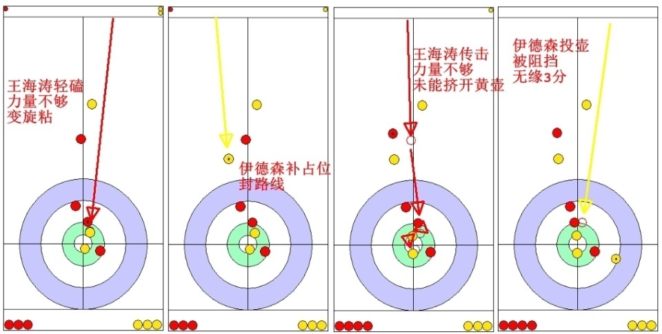 王海涛两投力量都小了点,没能将7区得分黄壶挤出,但伊德森也磕到6区红壶,没能拿下3分。