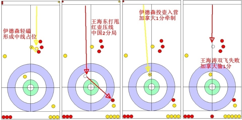 陈建新第二投溜壶,加拿大形成3分局面;王海涛第一投没能粘住,加拿大此时已经稳操胜券。