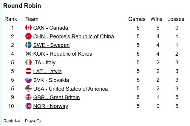 加拿大五连胜排在第一,中国和瑞典四胜一负并列第二;多比一场的韩国则压制东道主和拉脱维亚,排在第四位。