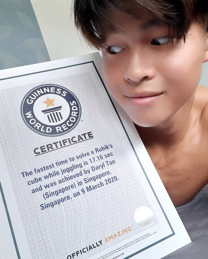 他第一个吉尼斯世界纪录,来自于疫情期间,他以17秒16的成绩创造单手抛球同时单手破魔方的最快吉尼斯世界纪录,过了三年,他把纪录提高到13秒03。