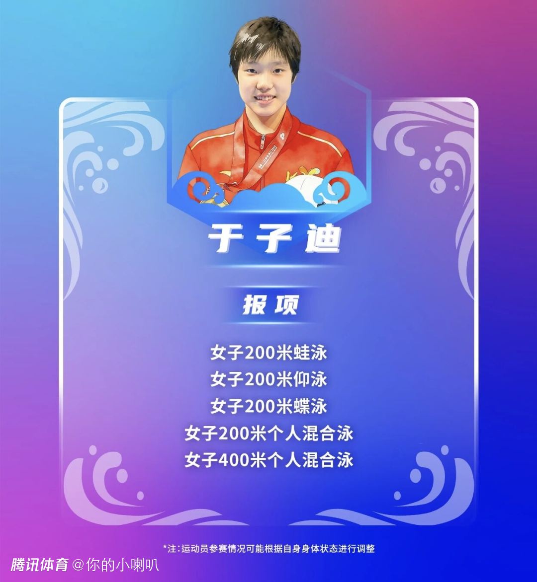 13岁新星于子迪报名多项混合泳与泳姿项目,以全能姿态崭露头角,成为新生代重点观察对象。唐钱婷专注蛙泳,持续巩固国内领先地位;何诗蓓、程玉洁等组成短距离自由泳主力群,与国外强手正面抗衡。