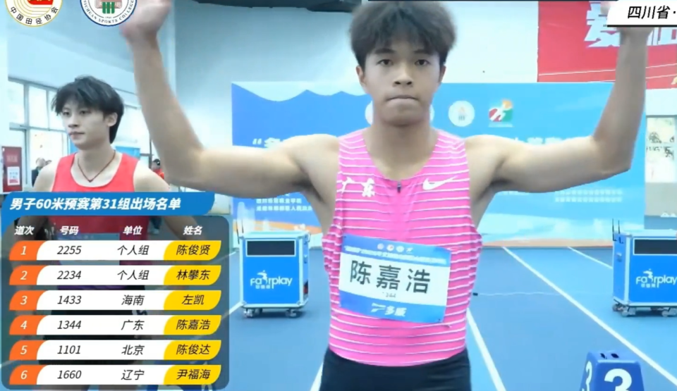 全国室内田径大奖赛成都站中午结束男子60米预赛,19岁广东小将吴昊霖以6秒63的个人最好成绩排名预赛第一。