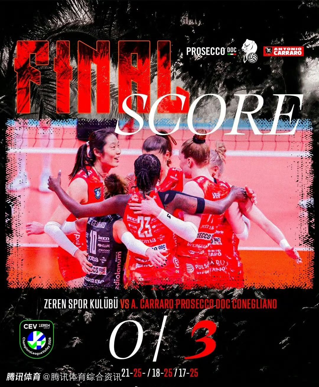 北京时间3月12日,2025-26赛季女排欧冠1/4决赛首回合开打,意大利科内利亚诺队3-0战胜土耳泽仁体育(25-21、25-18、25-17),在两回合较量中占得先机。朱婷本场贡献16分,与哈克并列全队第一。