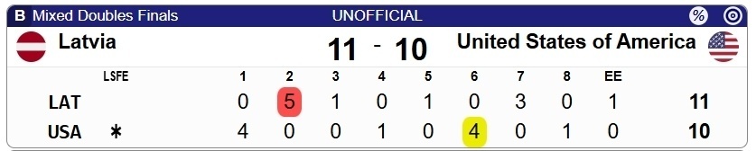 在同时进行的铜牌赛里,拉脱维亚组合拉兹科娃/拉斯曼斯同样在附加局后手,以11-10力克美国组合德维尔/史蒂芬,将铜牌收入囊中。
