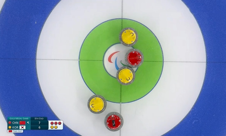 杨金桥传击没有成功,之后双方围绕占位壶展开交换;韩国队因为分数落后,采取补占位防守,不让中国拿多分。