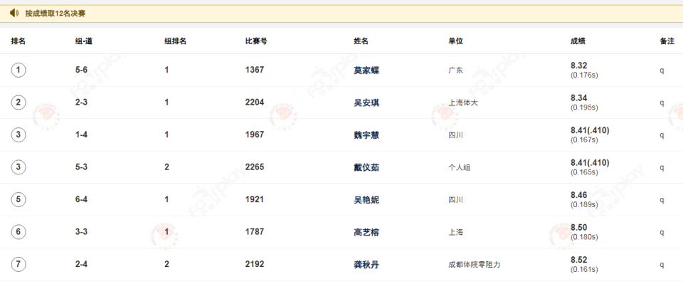 女子60米栏预赛总成绩,莫佳蝶8秒32排名第一,吴安琪8秒34第二,魏宇慧8秒41第三,戴仪茹8秒41并列第三,吴艳妮8秒46第五。决赛将于北京时间今天下午15点35分进行。