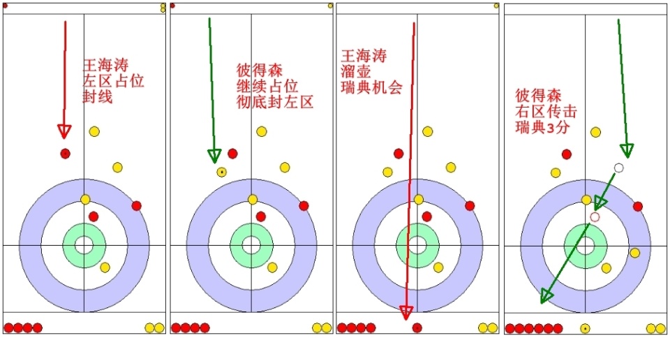 彼得森第一投还是磕到占位壶柄形成3颗黄壶串联的局面,王海涛继续入营;彼得森第二投力量小了,王海涛也赢的非常惊险,中国顺利拿3分。