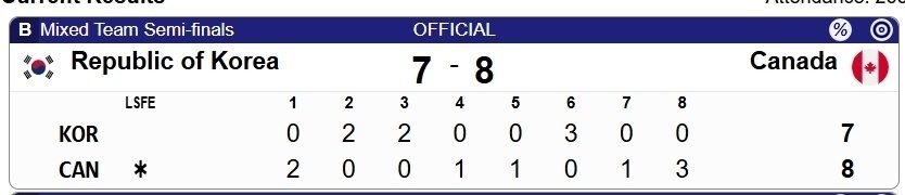在另一场半决赛里,加拿大队因为第三局出现重大失误,被韩国偷到2分;下半场又遭遇偷分丧失偶数后手等重大不利局面,但最终硬是在第八局偷3分,以8-7实现逆袭!