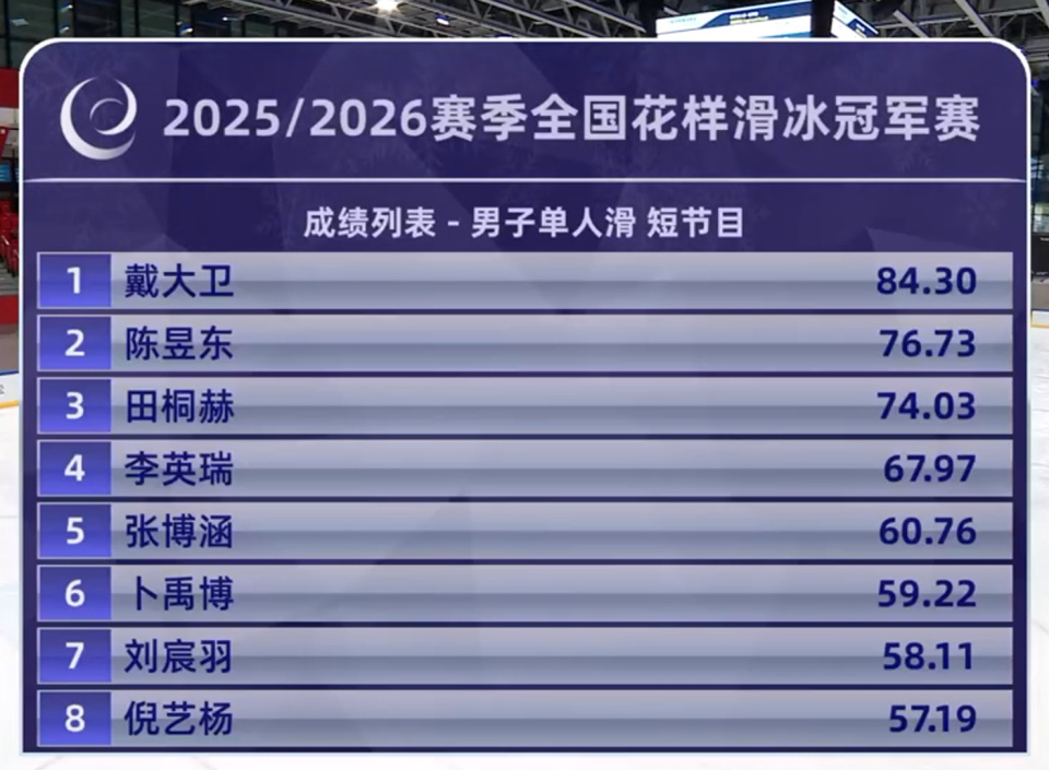 在刚刚结束的2026全国花滑冠军赛男单短节目里,戴大卫以84.30分位列第一;即将代表中国出战世锦赛的陈昱东,以76.73排在第二。
